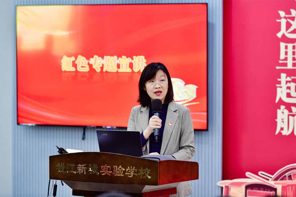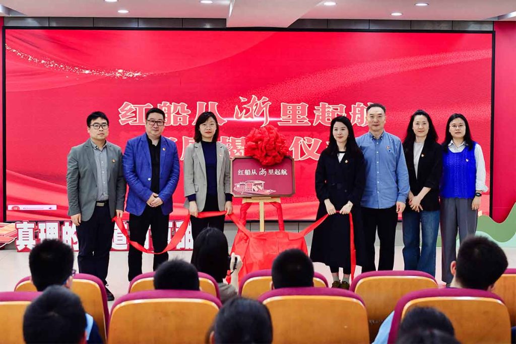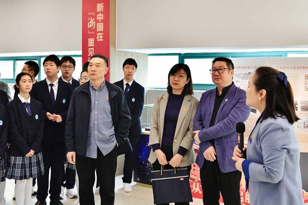 活动伊始,领导嘉宾与师生代表一同参观《红船从 “浙” 里起航》校园巡展,听浙博讲解员解读红色文物里的党史故事,在红色拓印、书签制作等互动中沉浸式感受红色文化。
